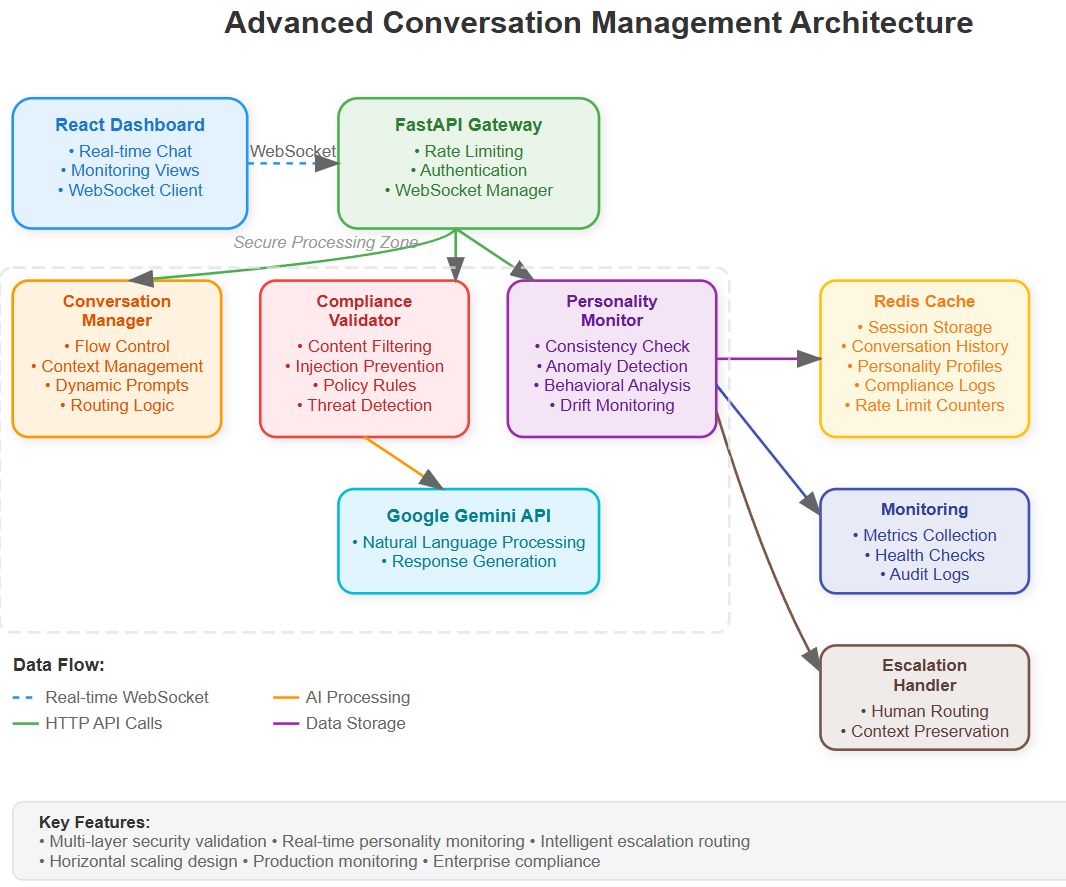 Today we're constructing a sophisticated conversation management system that goes beyond basic chat functionality. Think of it as the neural pathway of your AI agent—managing conversation flow, ensuring compliance, preventing malicious inputs, and maintaining consistent personality while routing complex conversations appropriately.