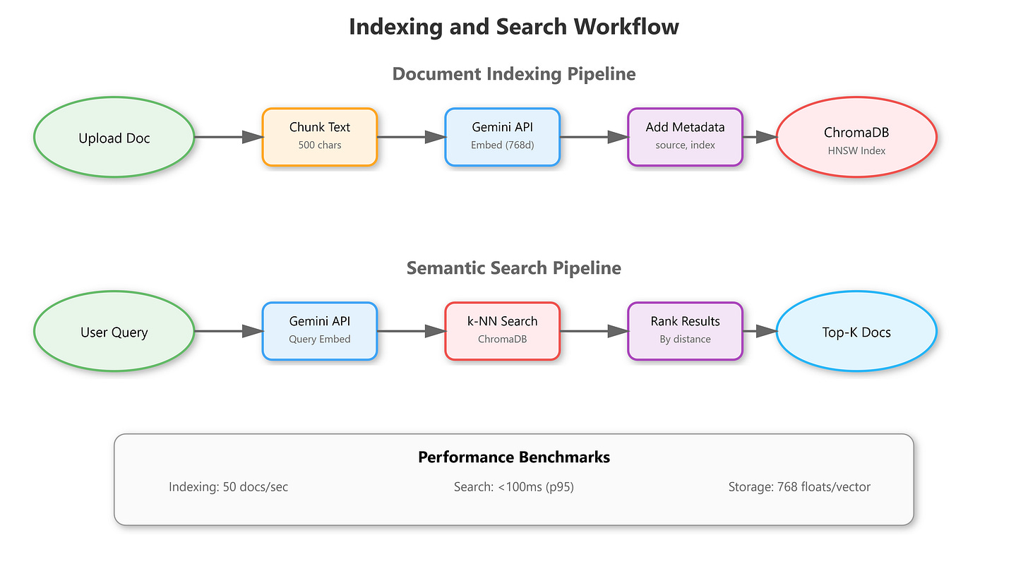 Workflow: Document → Chunk → Embed (Gemini API) → Index (ChromaDB collection) → Query → k-NN Search → Ranked Results
