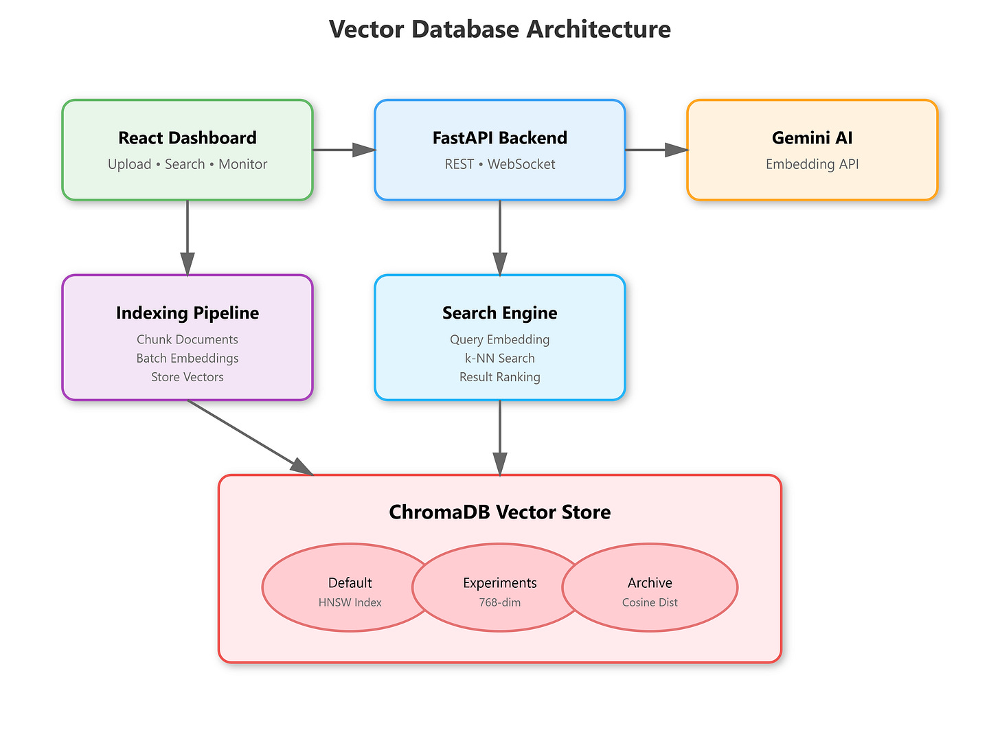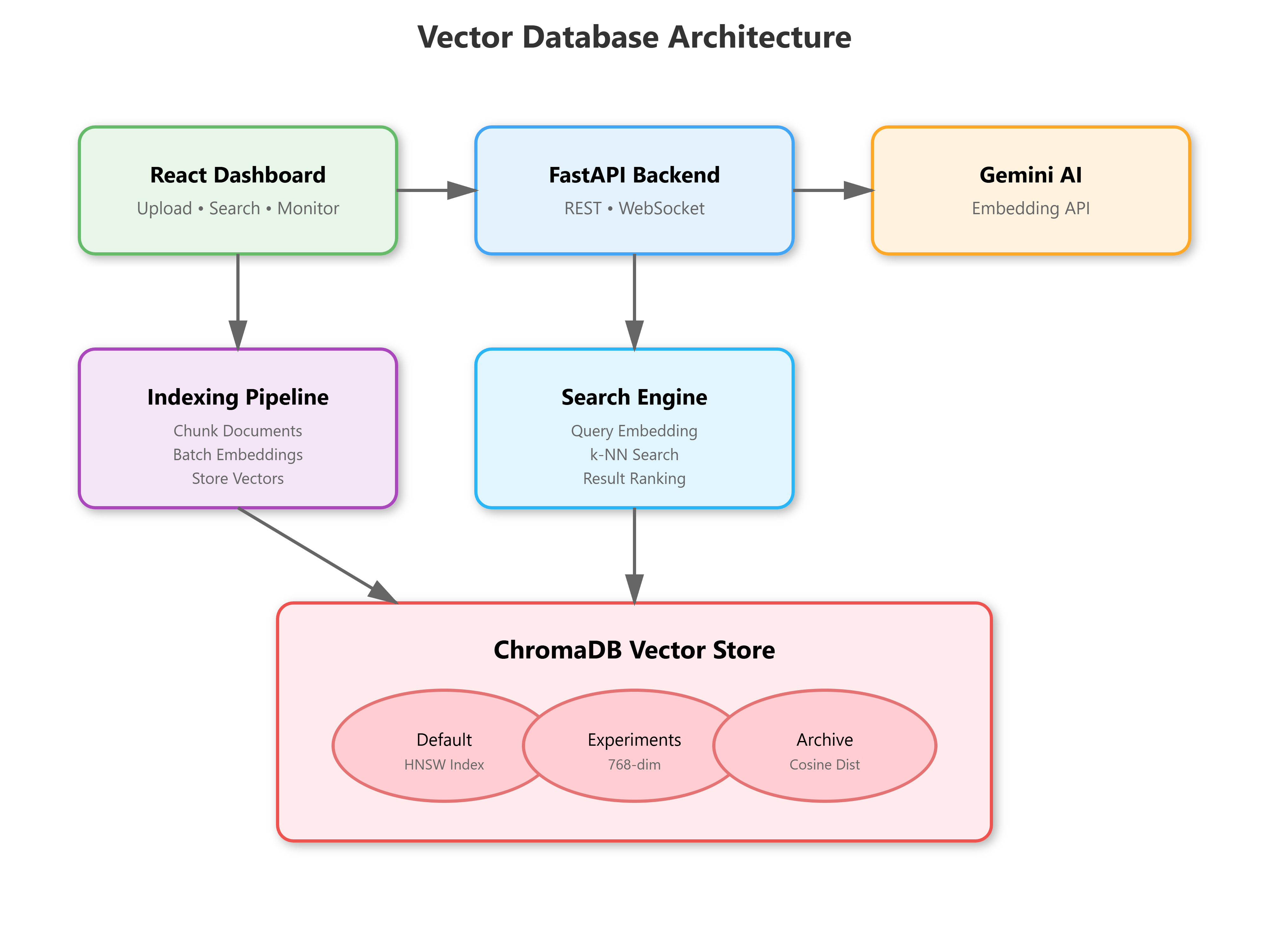 VectorStore: ChromaDB client with collection management, embedding integrationEmbeddingService: Gemini API wrapper that batches requests, handles rate limitsIndexingPipeline: Coordinates chunking → embedding → storage with retry logicSearchEngine: Query processing, metadata filtering, result rankingDashboard: Real-time visualization of indexed docs, search performance, collection stats