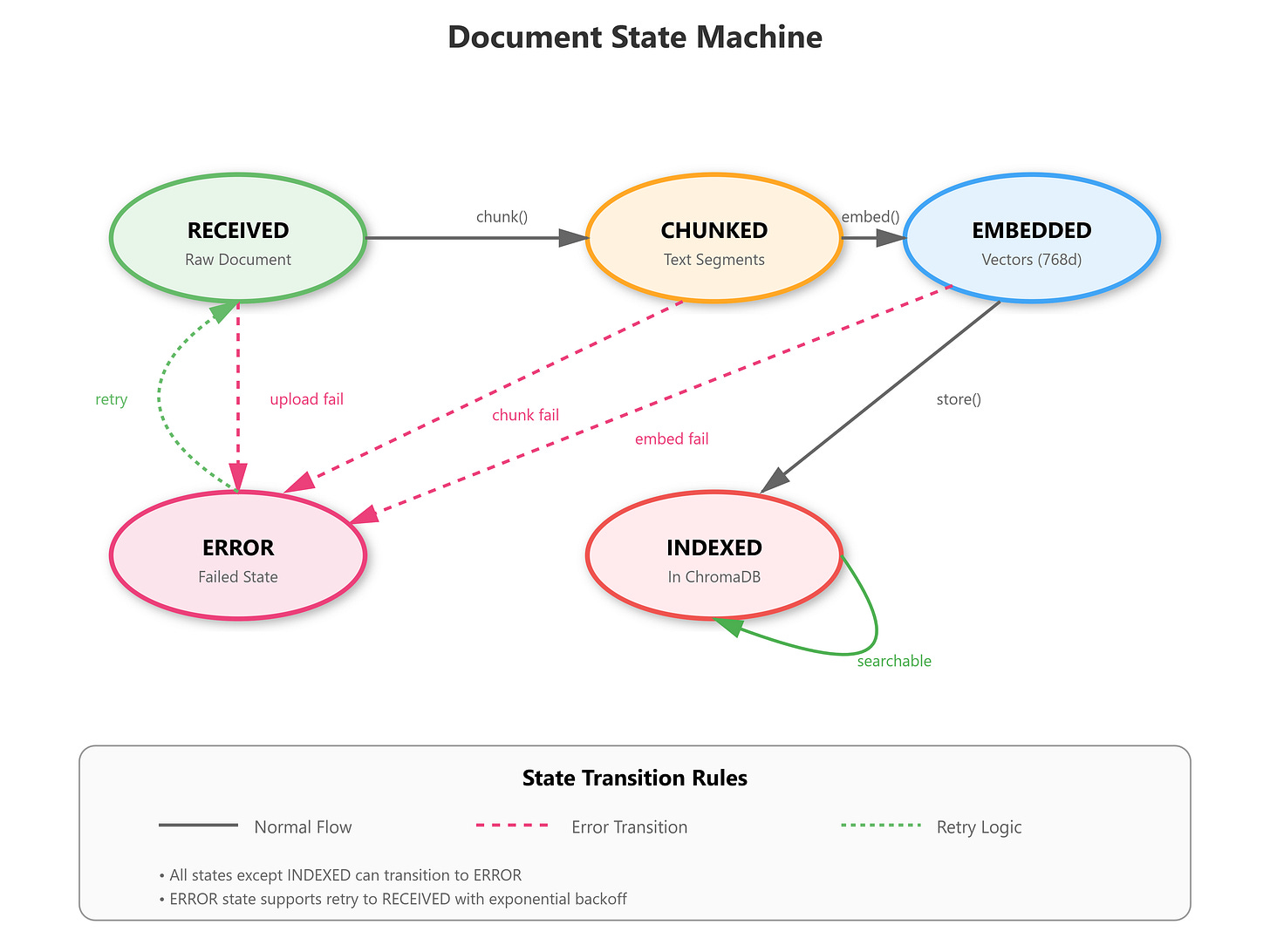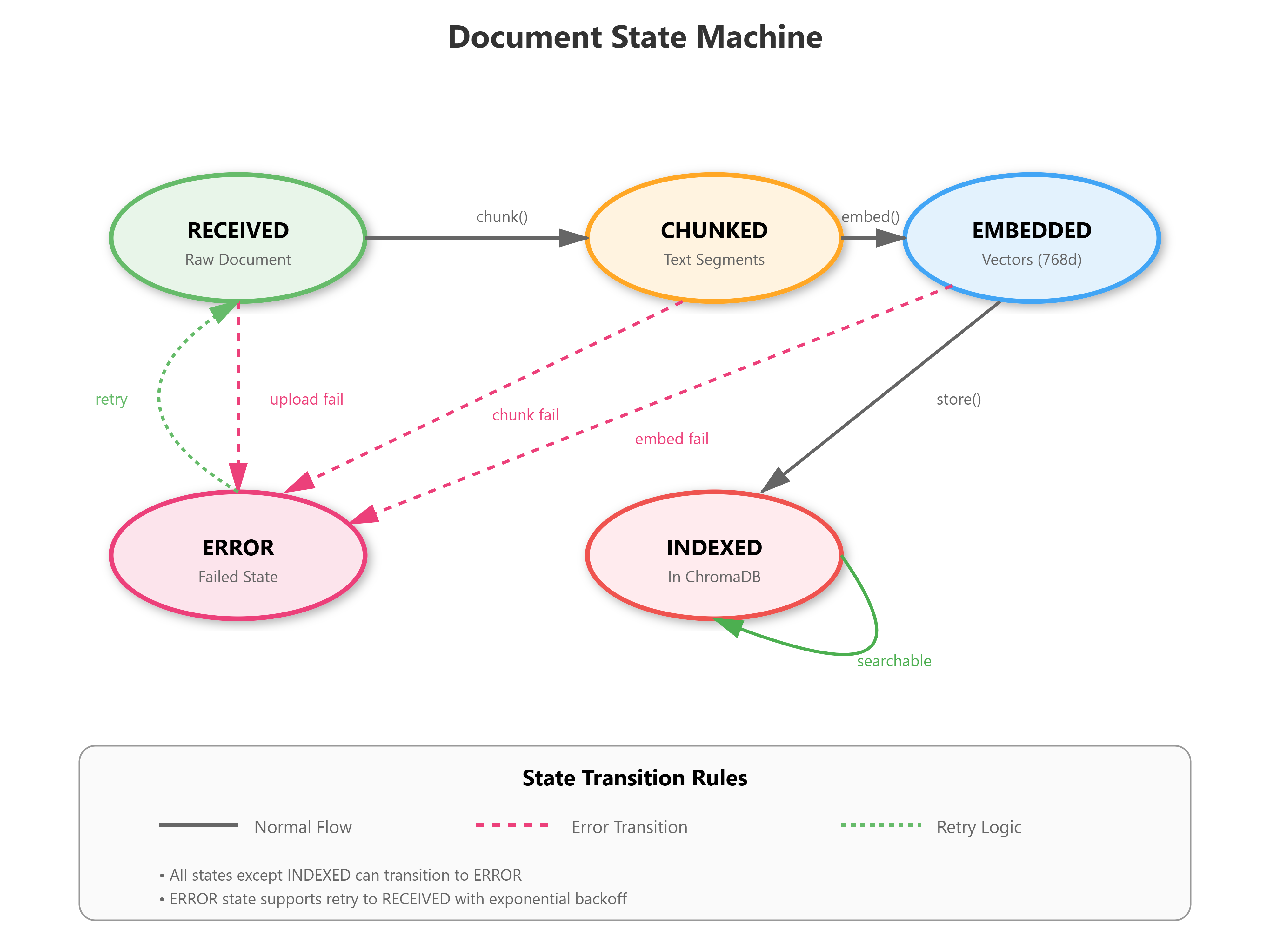 State Changes: Documents transition through RECEIVED → CHUNKED → EMBEDDED → INDEXED states, with each step validated before progression.