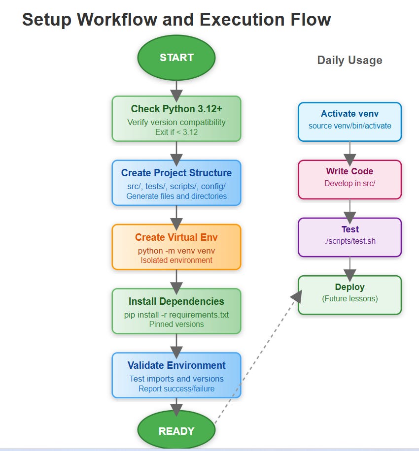 Position in 90-Lesson Path: We’re at the start of Module 1 (Foundations). This lesson establishes the development baseline that every subsequent module depends on. By L30, we’ll have built multi-agent systems handling millions of requests—but it all starts with a correctly configured Python environment.