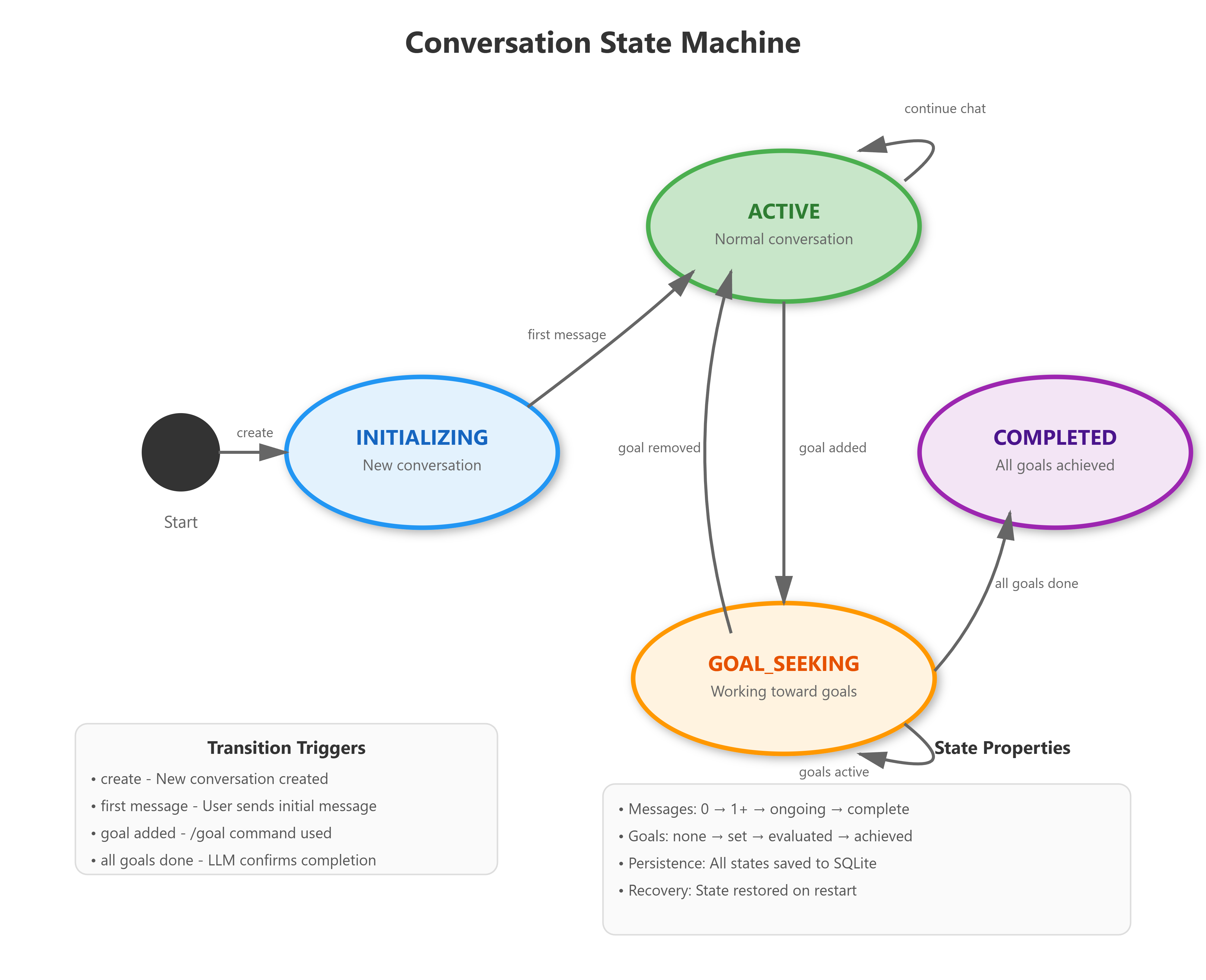 Every conversation moves through a predictable lifecycle. Your agent starts in an INITIALIZING state when created. It moves to ACTIVE after the first message. When someone sets a goal, it shifts to GOAL_SEEKING. Once all goals complete, it reaches COMPLETED.
