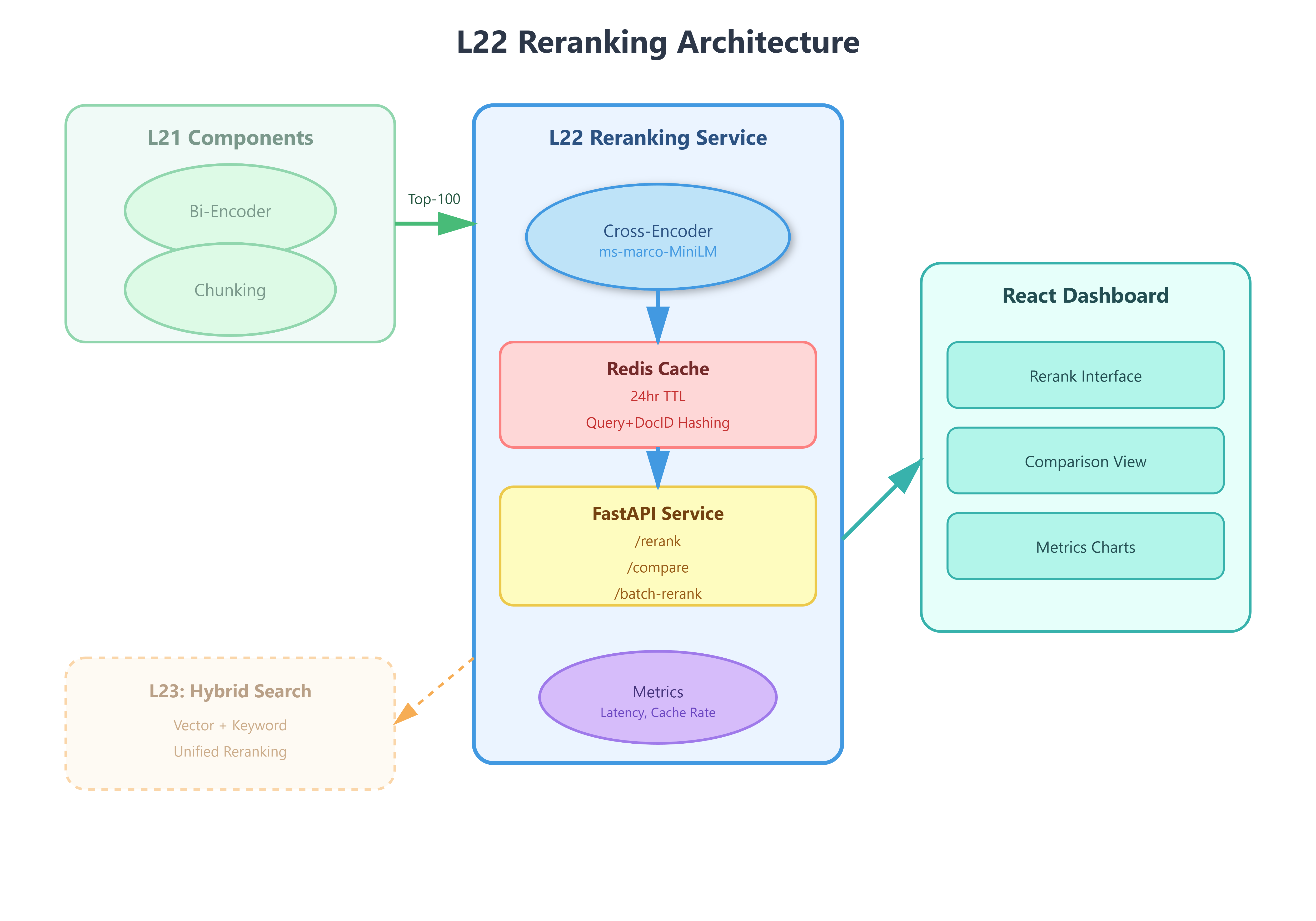 Integration with L21: We build directly on L21’s chunking pipeline and embedding service, adding a reranking layer that operates on the retrieved candidates. The semantic chunking output from L21 becomes reranking input.