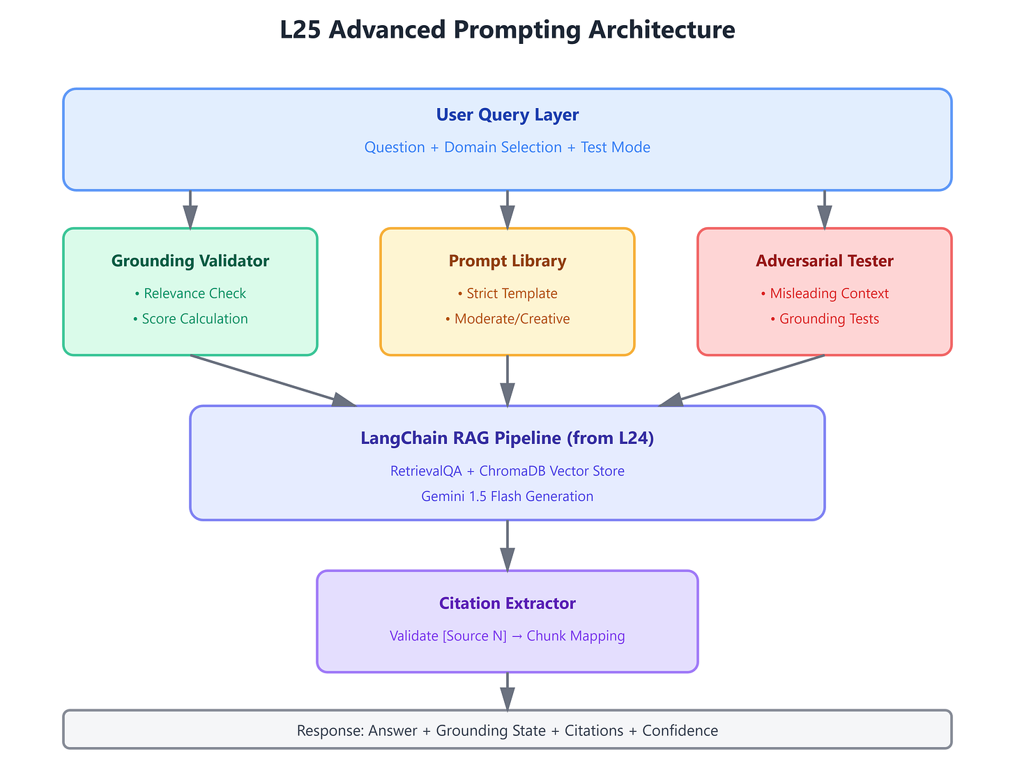 This builds directly on L24’s modular LangChain pipeline by replacing generic prompts with production-grade grounding strategies. We’re taking the RetrievalQA chain and teaching it to say “I don’t know” when context is insufficient—the hardest problem in RAG systems.