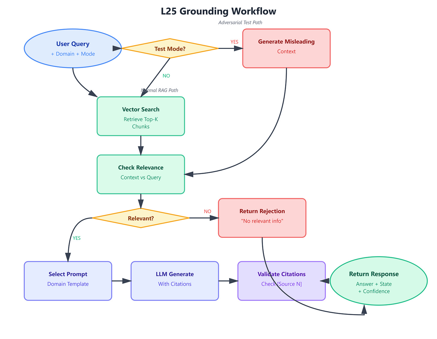 The Irrelevance Test: Production RAG must handle queries where retrieval returns nothing useful. A properly grounded system responds “The provided documents don’t contain information about X” rather than fabricating answers. This requires teaching the LLM to evaluate context relevance before answering.