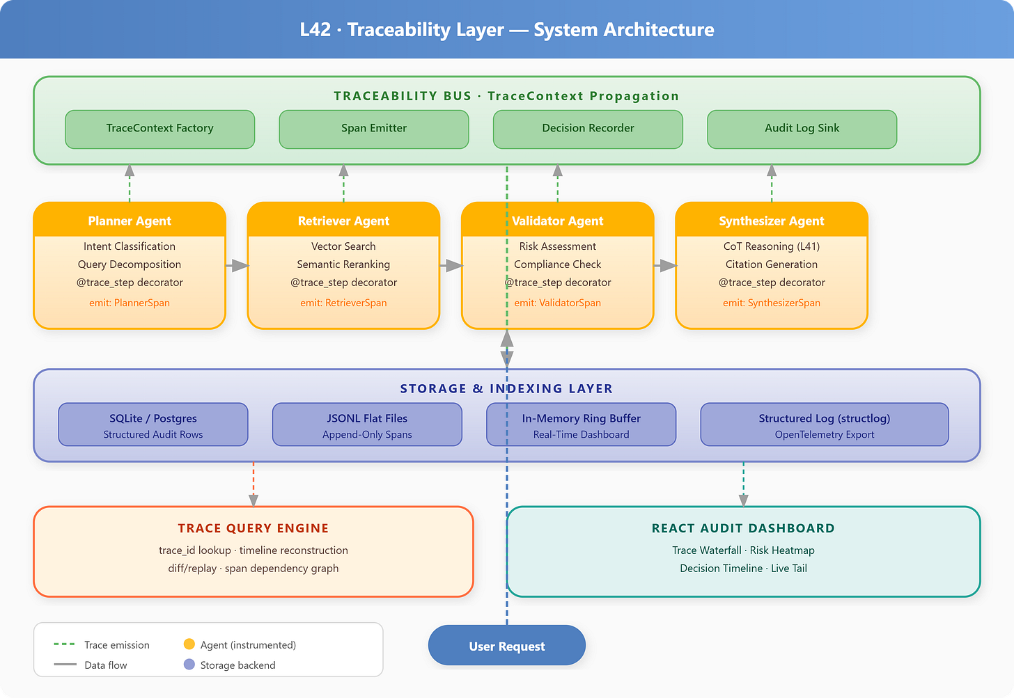 Enables L43: In the Agentic RAG end-to-end lesson, the traceability layer is the connective tissue. Without it, integration testing is blind. With it, every failed run becomes a replayable incident.
