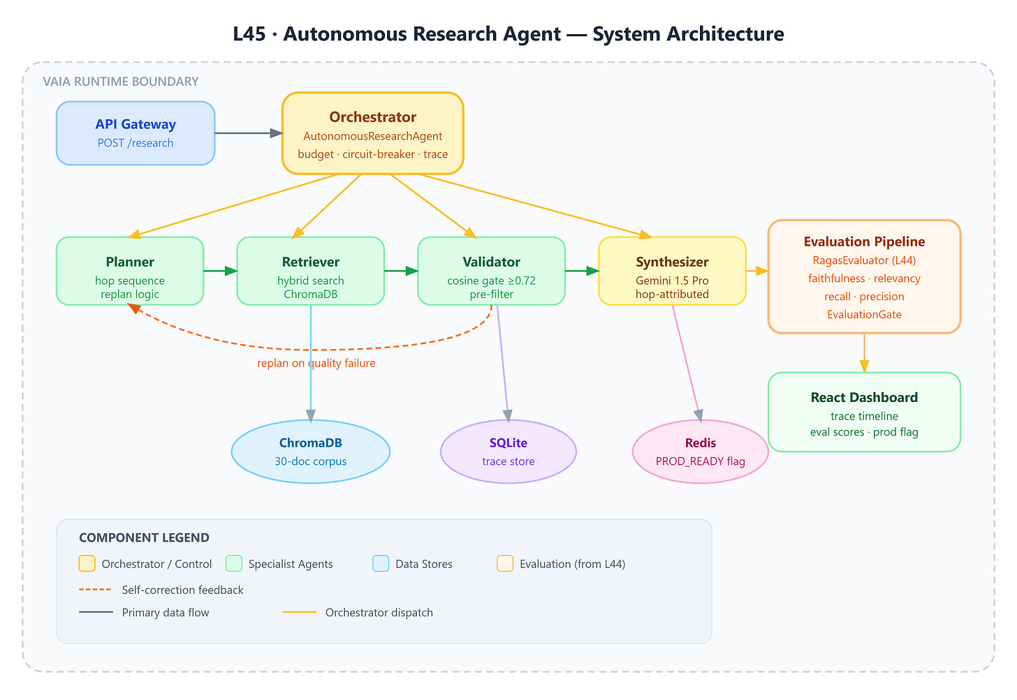 RagasEvaluatorandEvaluationGatecapable of scoring any{question, answer, contexts}triple against faithfulness ≥0.85, answer_relevancy ≥0.80, context_recall ≥0.75, and context_precision ≥0.70. L45 embeds those components directly into the agent’s execution path — evaluation is no longer a post-hoc audit; it is a first-class runtime gate.