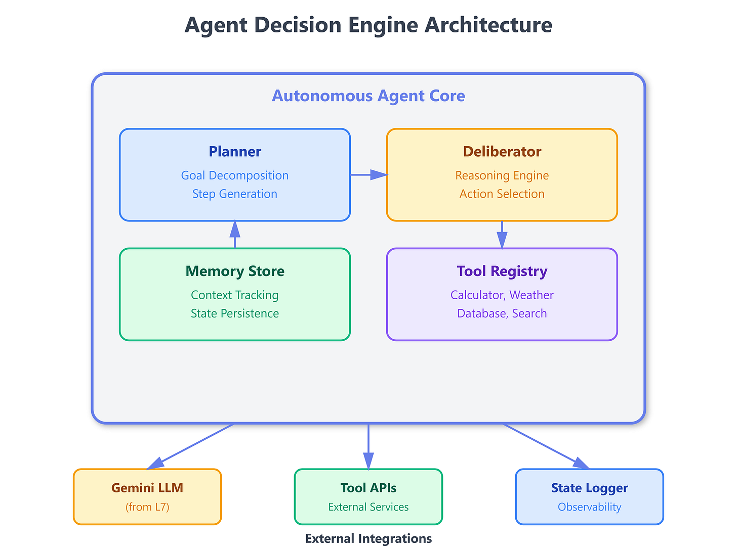 Integration with L7: We reuse L7’s gemini_json_call() function that returns structured data. L8 wraps this in a deliberation loop: the agent decides what question to ask, parses the JSON response, and chooses the next action. The LLM becomes a reasoning engine, not just an API endpoint.